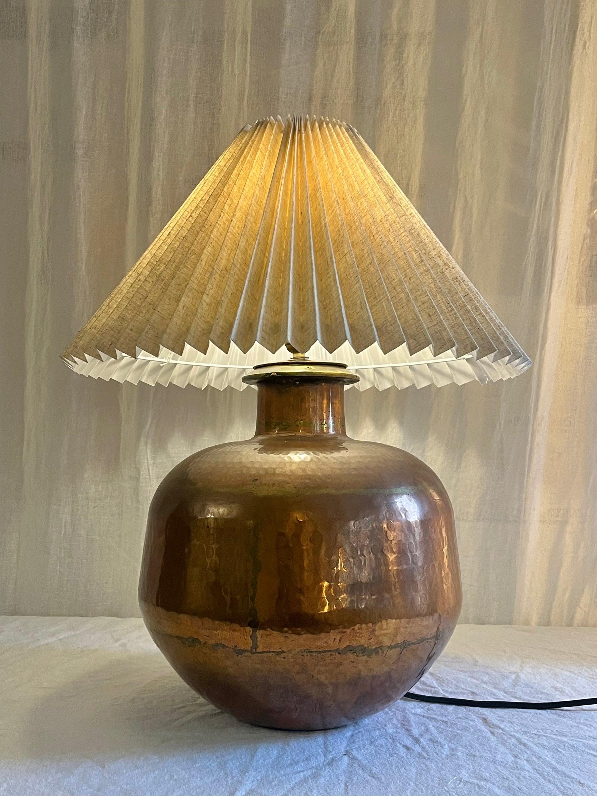 A hammered copper Indian vessel that has been carefully constructed into a lamp.