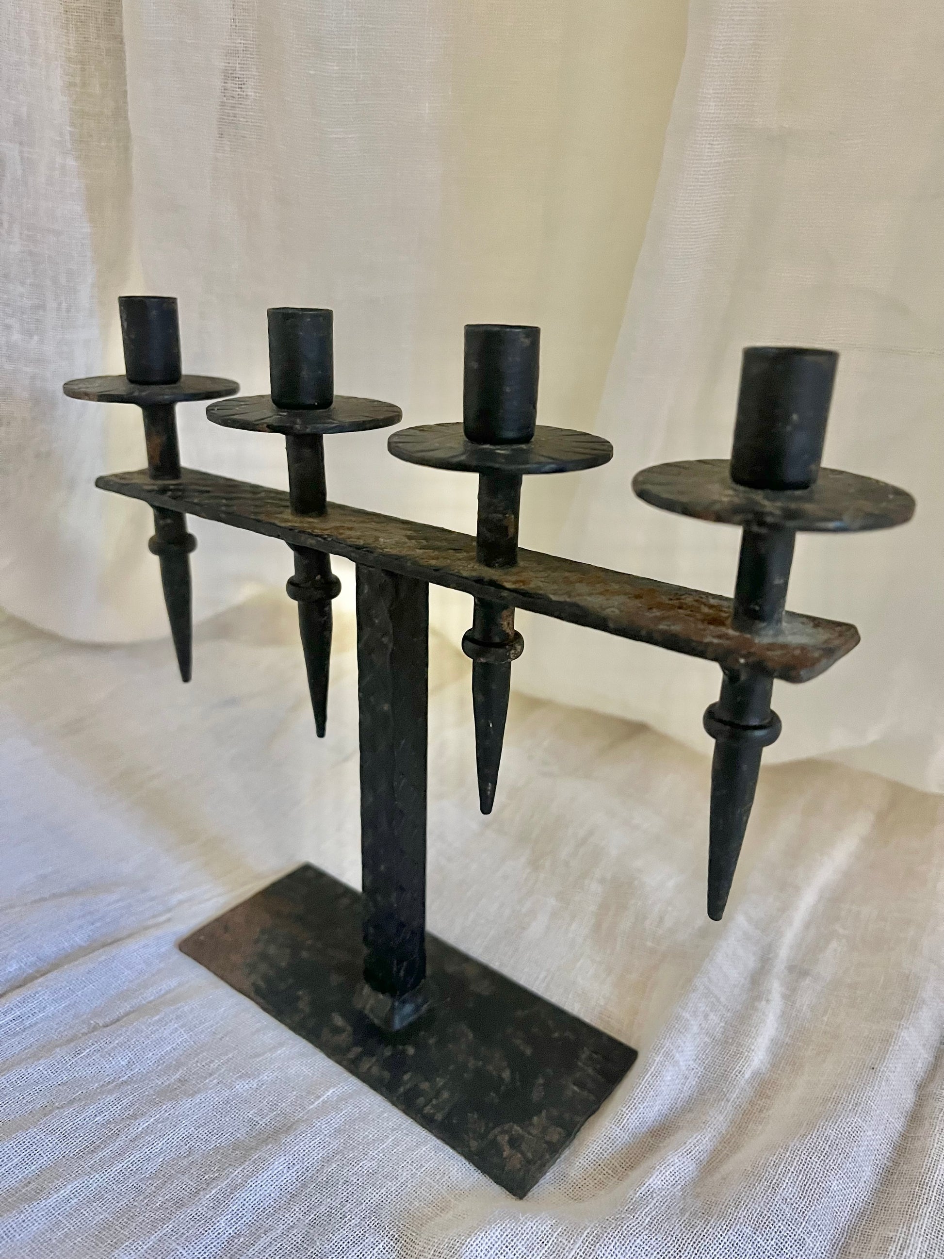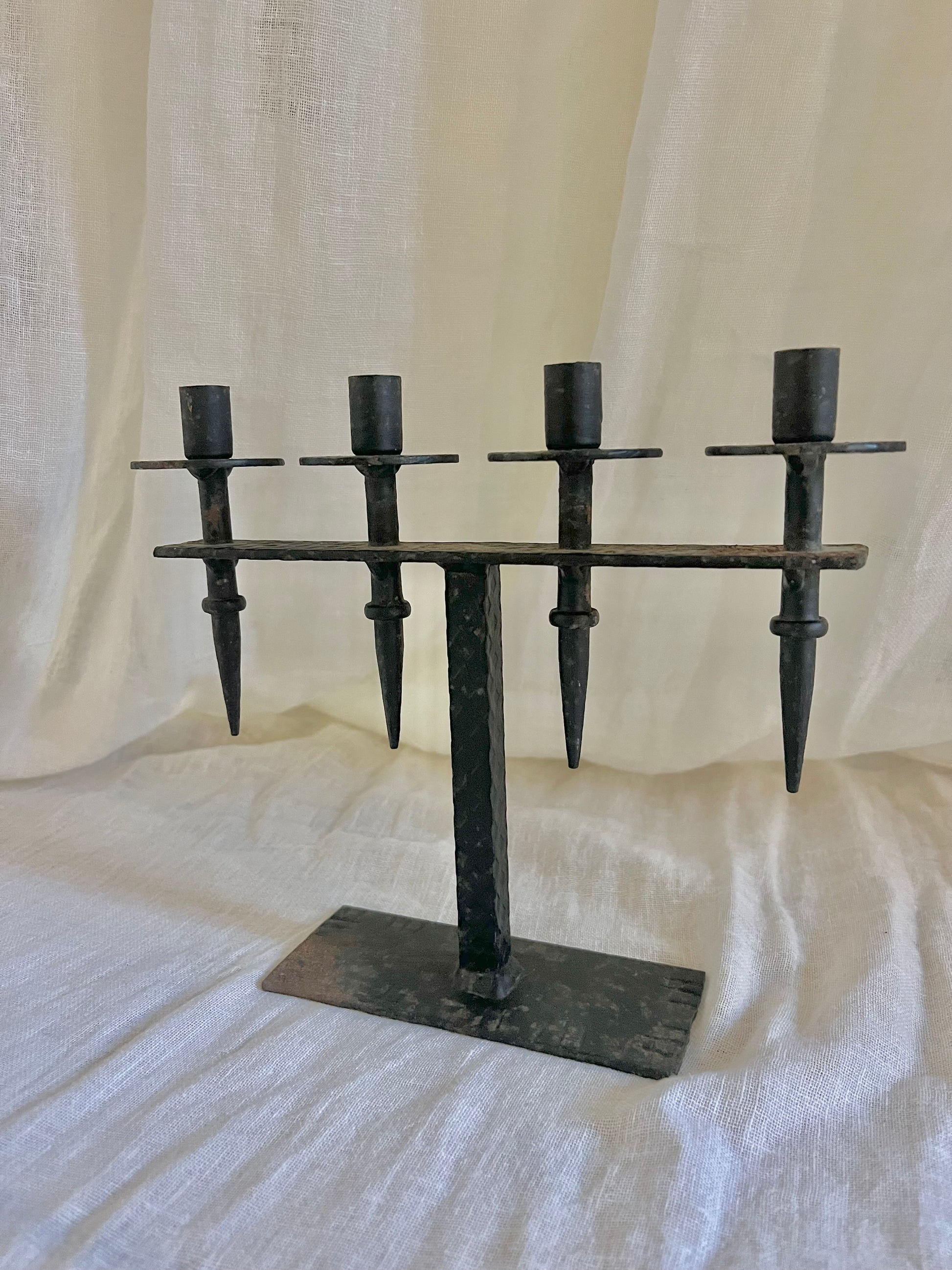 A small but mighty brutalist candelabra, made from pieces of wrought iron moulded and welded together into a perfect form.